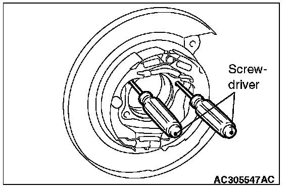 Insert flat-tipped screwdrivers into the mounting holes of knuckle hub to prevent the rear brake shoe and backing plate from falling down after the rear hub assembly has been removed from the knuckle.