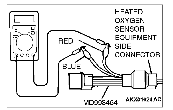 1. Disconnect the heated oxygen sensor connector and connect special tool MD998464 to the connector on the heated oxygen sensor side.