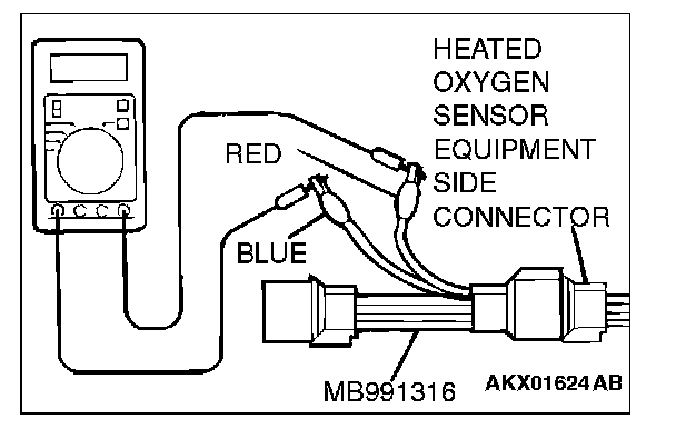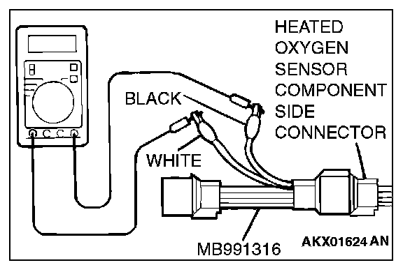 1. Disconnect the heated oxygen sensor connector and connect special tool MB991316 to the connector on the heated oxygen sensor side.