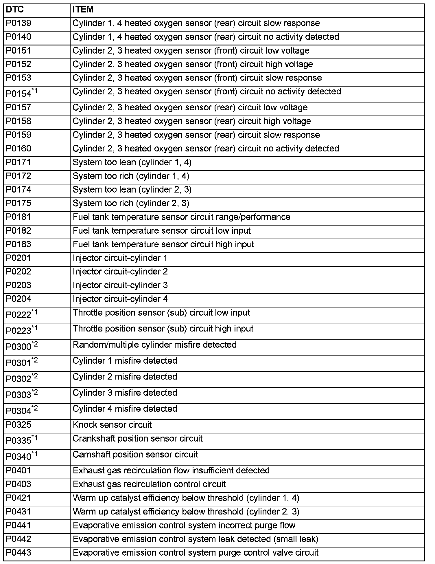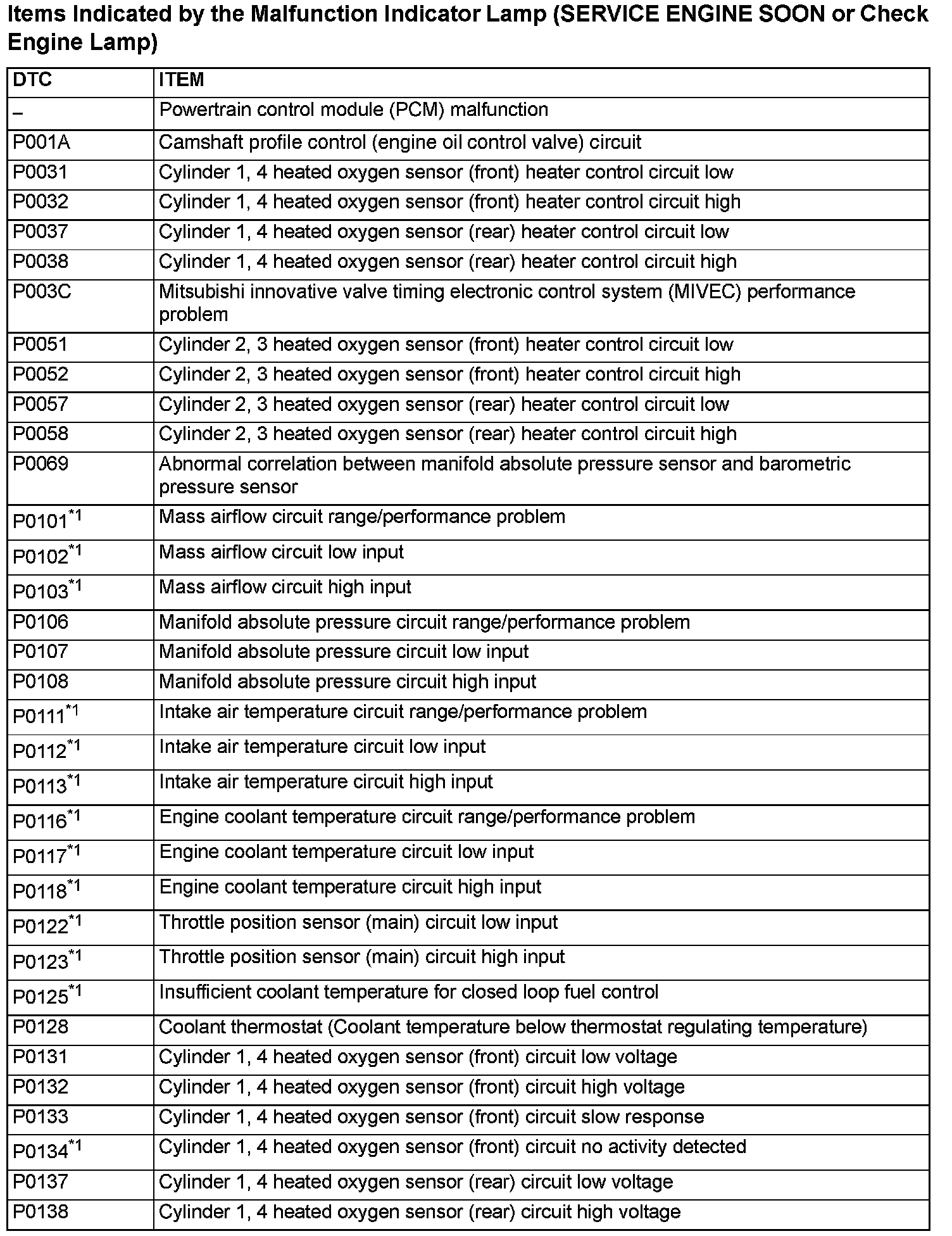 - The codes marked with a "*2" in the diagnosis code number column have the following two conditions for illuminating the Malfunction Indicator Lamp (SERVICE ENGINE SOON or Check Engine Lamp).