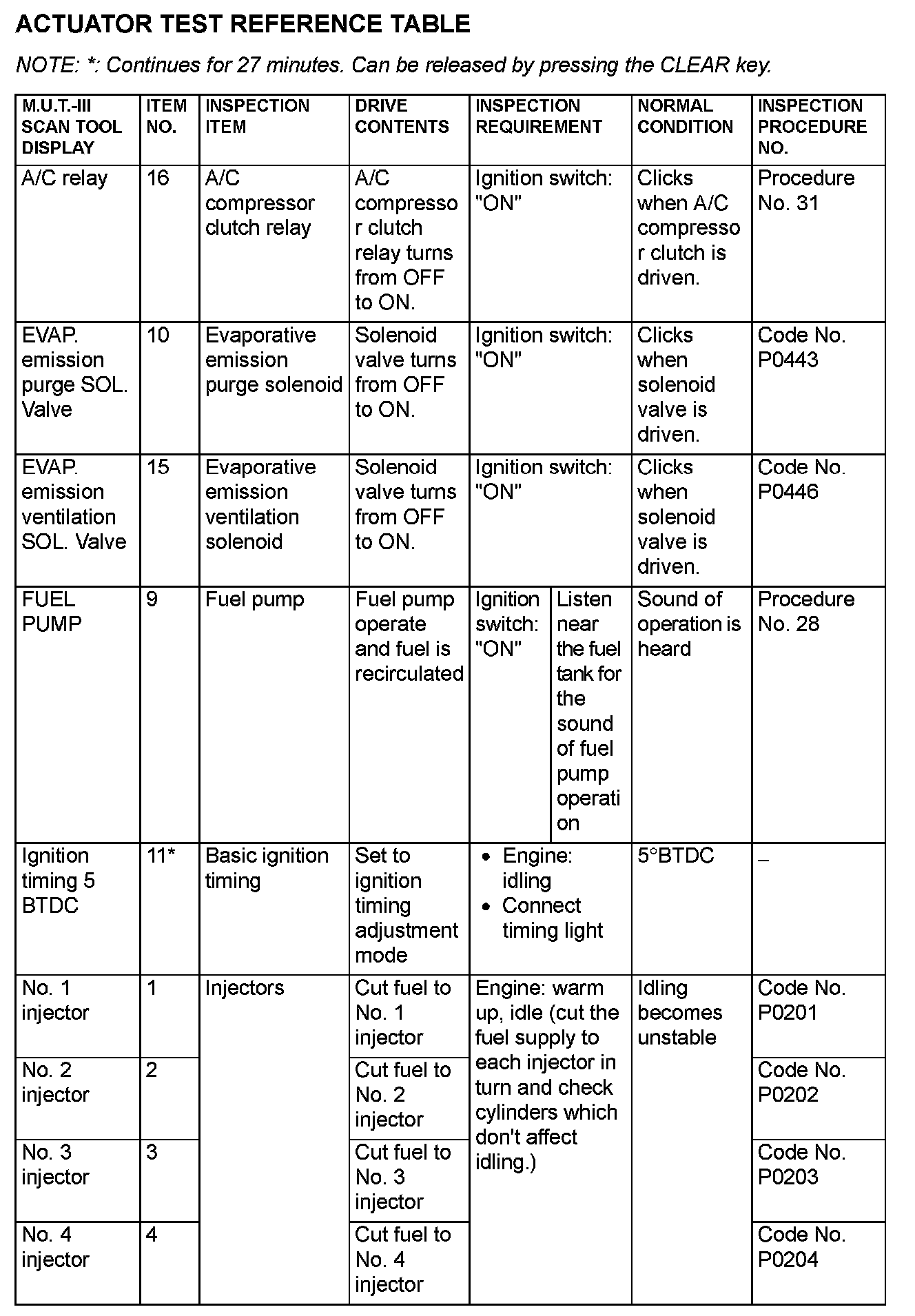 Actuator Test Reference Table (Part 1):