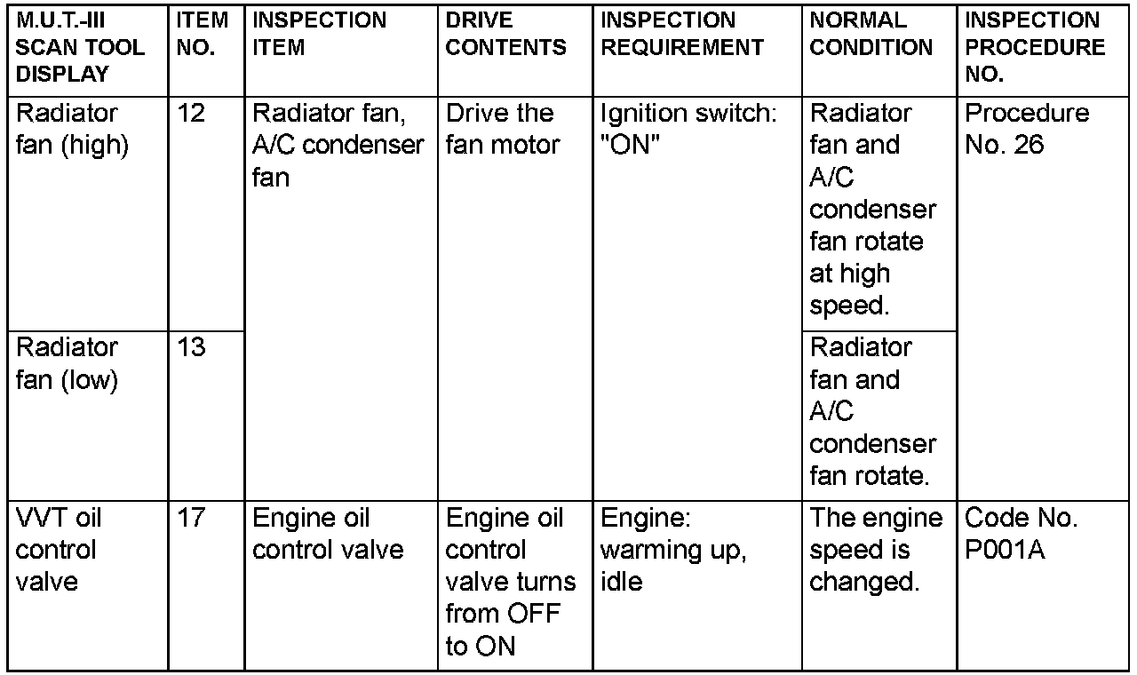 Actuator Test Reference Table