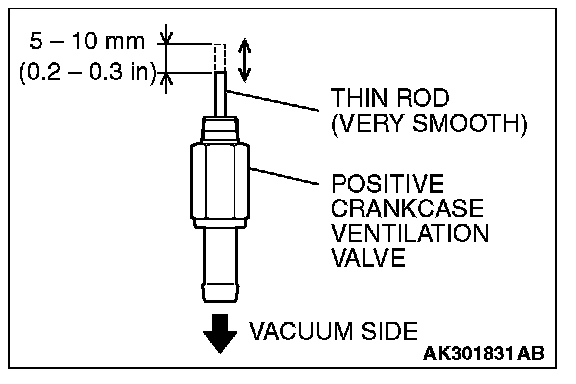 POSITIVE CRANKCASE VENTILATION VALVE CHECK1. Hold the positive crankcase ventilation (PCV) valve with the vacuum side down. Insert a thin rod, and using light pressure, depress the end of the PCV valve spring by 5 - 10 mm (0.2 - 0.3 inch). Release pressure on the rod to see if the PCV valve spring will lift the rod to its original position.
