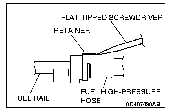 2. Turn the flat-tipped screwdriver approximately 90 degrees to the arrowed direction, and lift the retainer to unlock and disconnect the fuel high-pressure hose.