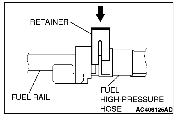 2. Install the fuel high-pressure hose to the fuel rail securely and push the retainer of fuel high-pressure hose downward and lock thoroughly.