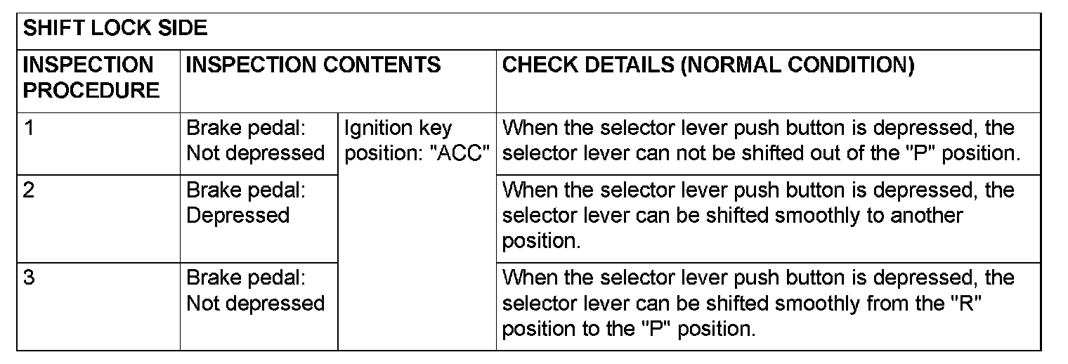 KEY INTERLOCK AND SHIFT LOCK MECHANISM CHECK1. Carry out the following inspection.