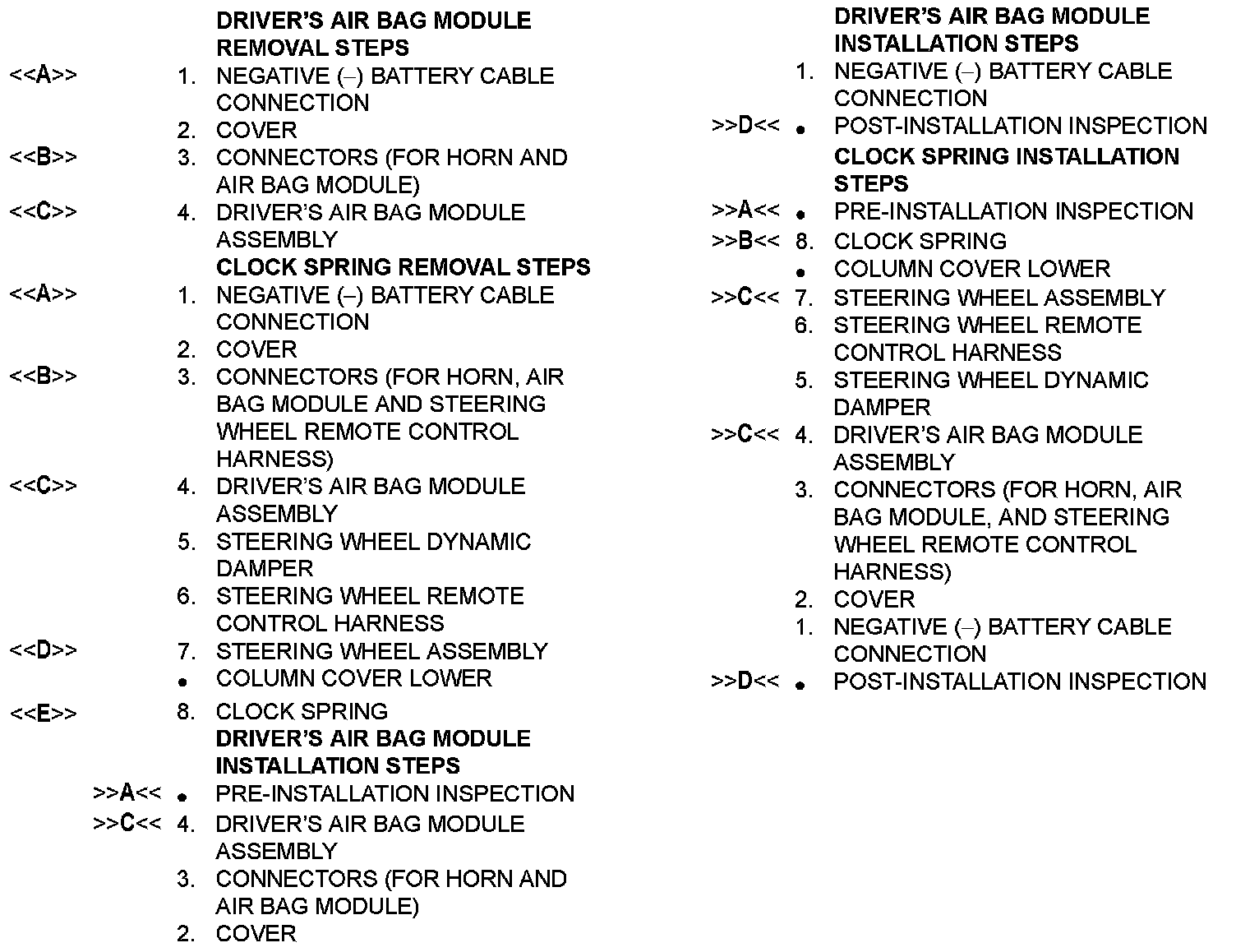 - Never attempt to disassemble or repair the air bag modules or clock spring. If faulty, replace it.