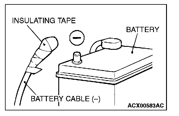 6. Turn the ignition switch to the "LOCK" (OFF) position. Disconnect the negative (-) battery cable and tape the terminal to prevent accidental connection and air bags deployment.