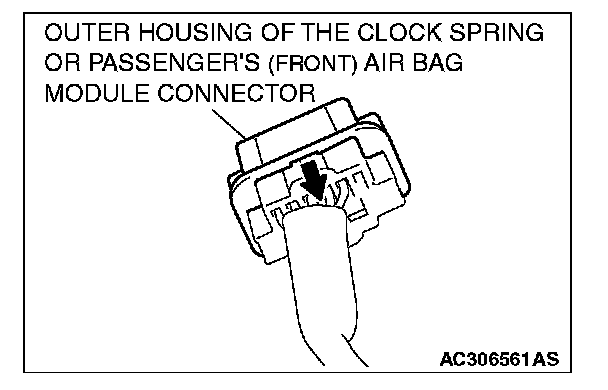 Slide the outer housing of the clock spring or passenger's (front) air bag module connector in the arrow direction shown, and disconnect the connector.