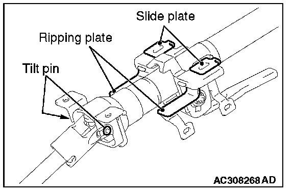 STEERING COLUMN SHAFT ASSEMBLY SHOCK ABSORBING MECHANISM CHECK^ If a collision occurs or severe impact is applied to the steering wheel, the collision energy absorbing mechanism (slide plate, ripping plate, tilt pin) may have operated. Once the mechanism has operated, it will be inoperative even if there is no apparent damage. Determine if the steering column shaft can be reused by the following procedure. If the collision energy absorbing mechanism has already operated, replace the steering column assembly.