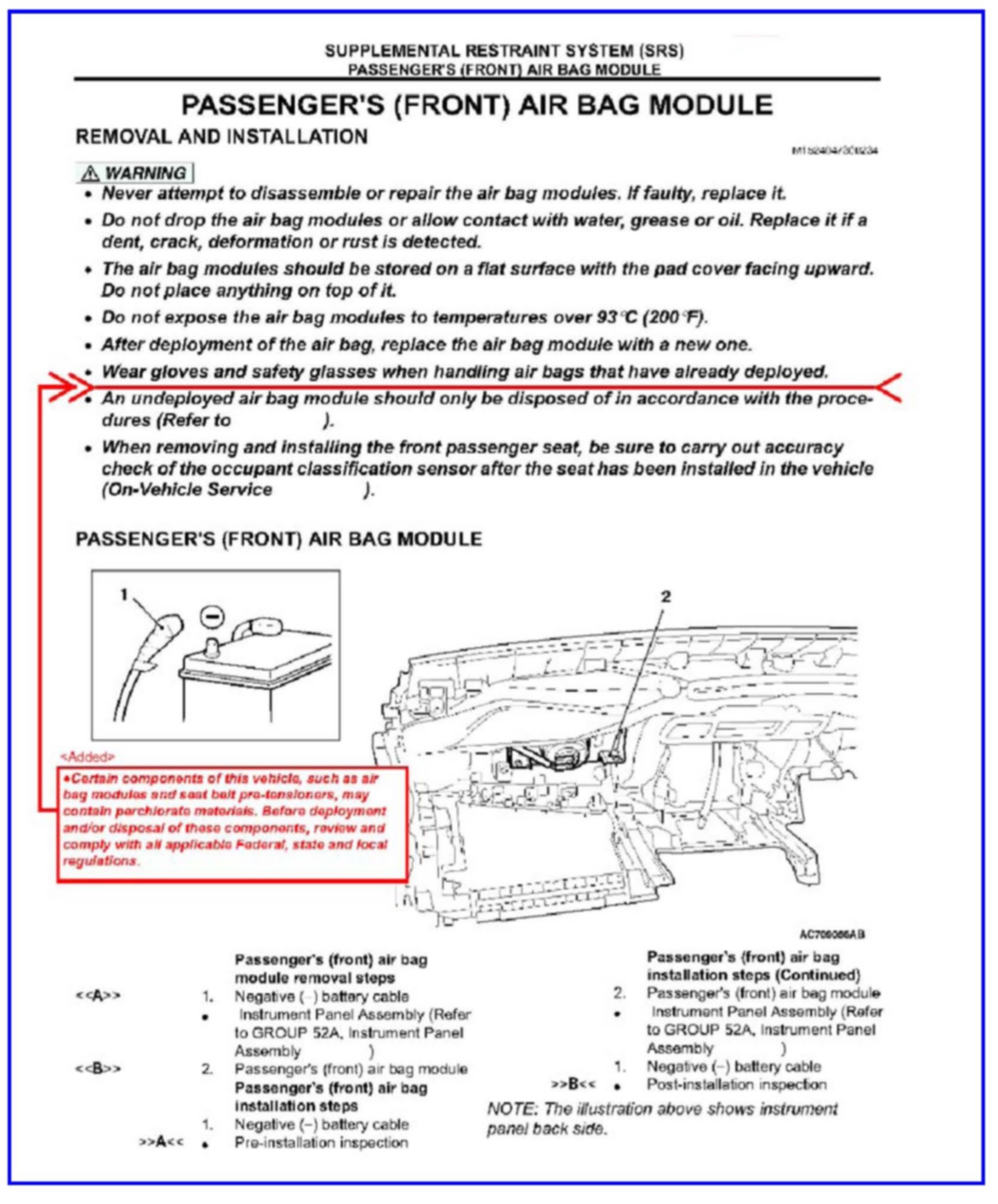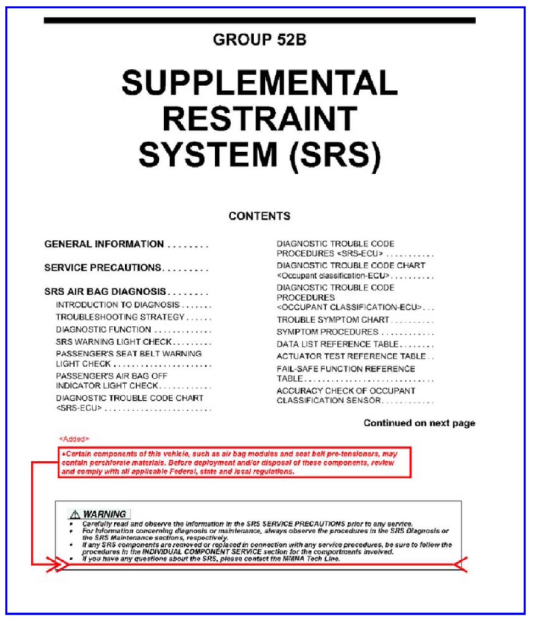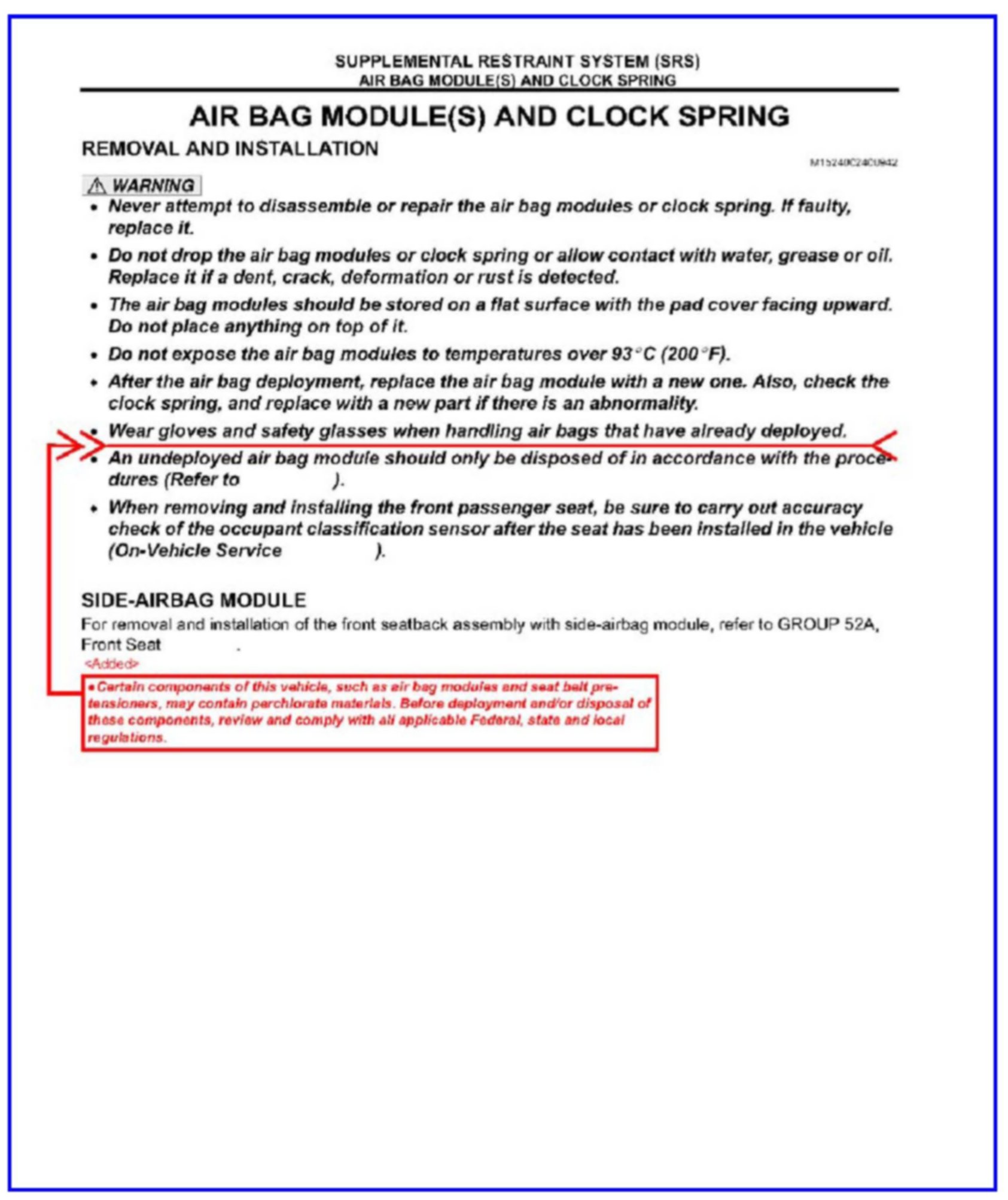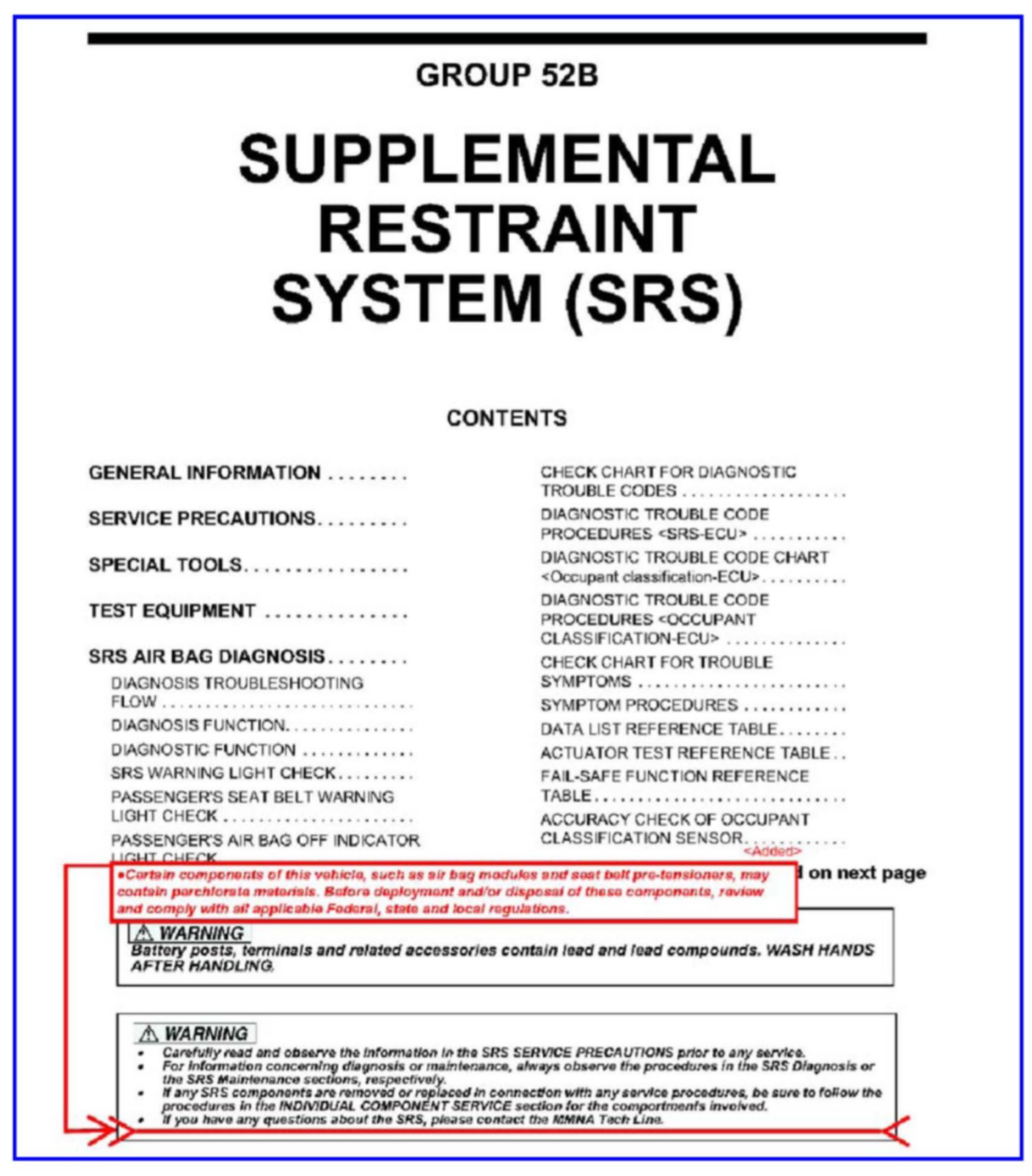 Caution statements regarding the disposal of certain SRS components have been incorrect in the service manuals of affected vehicles. This TSB provides updated caution statements.