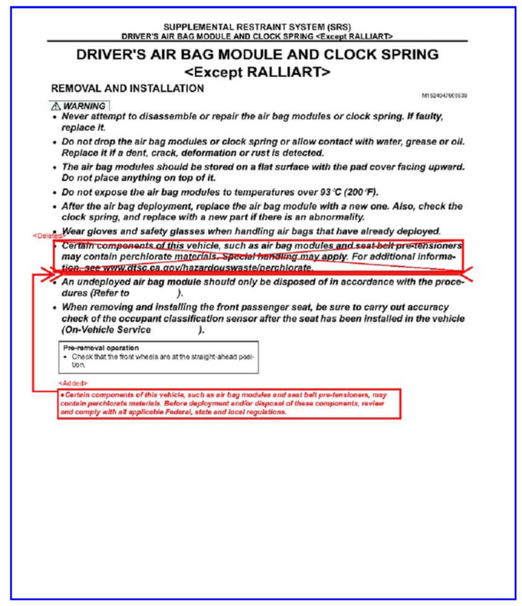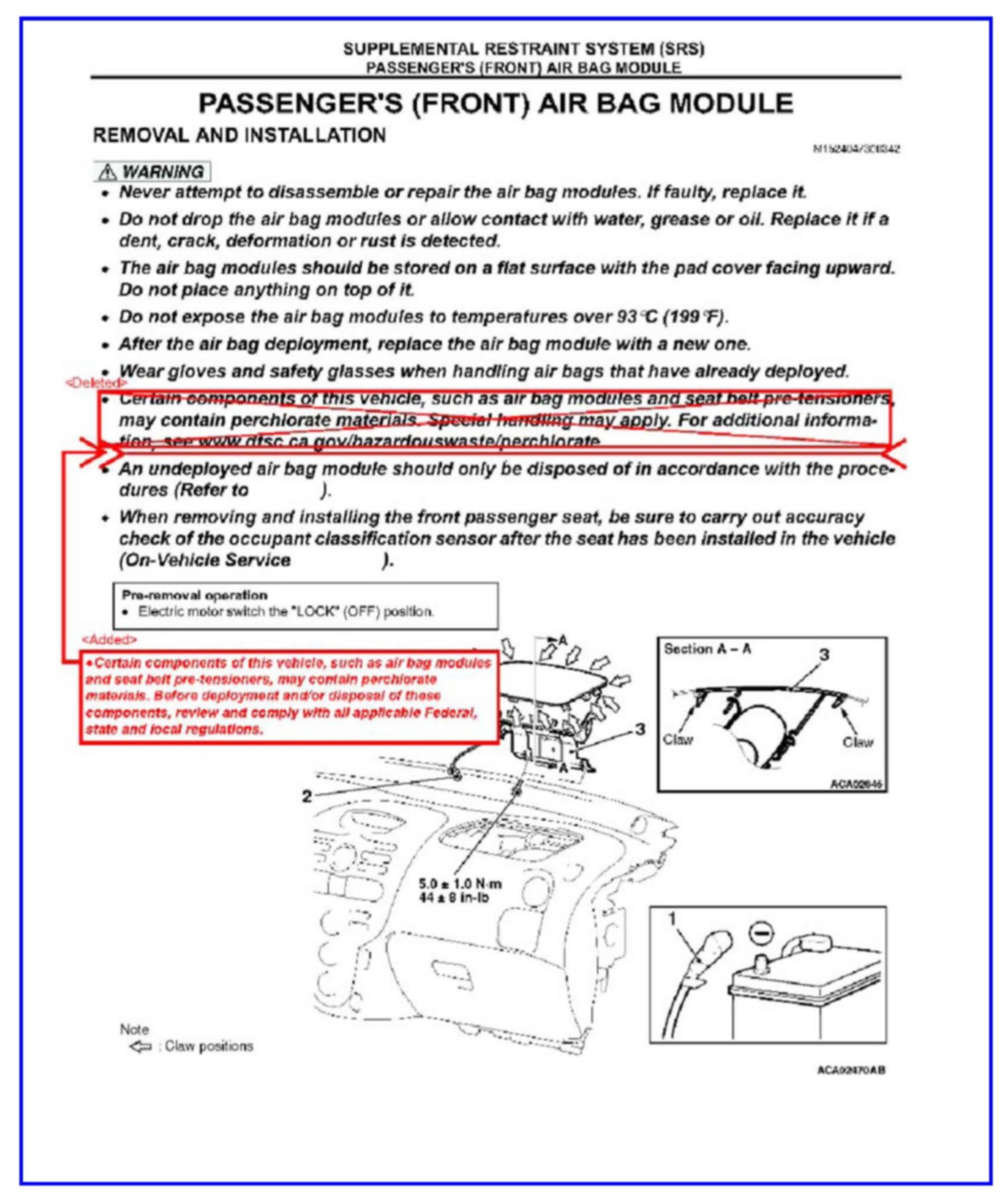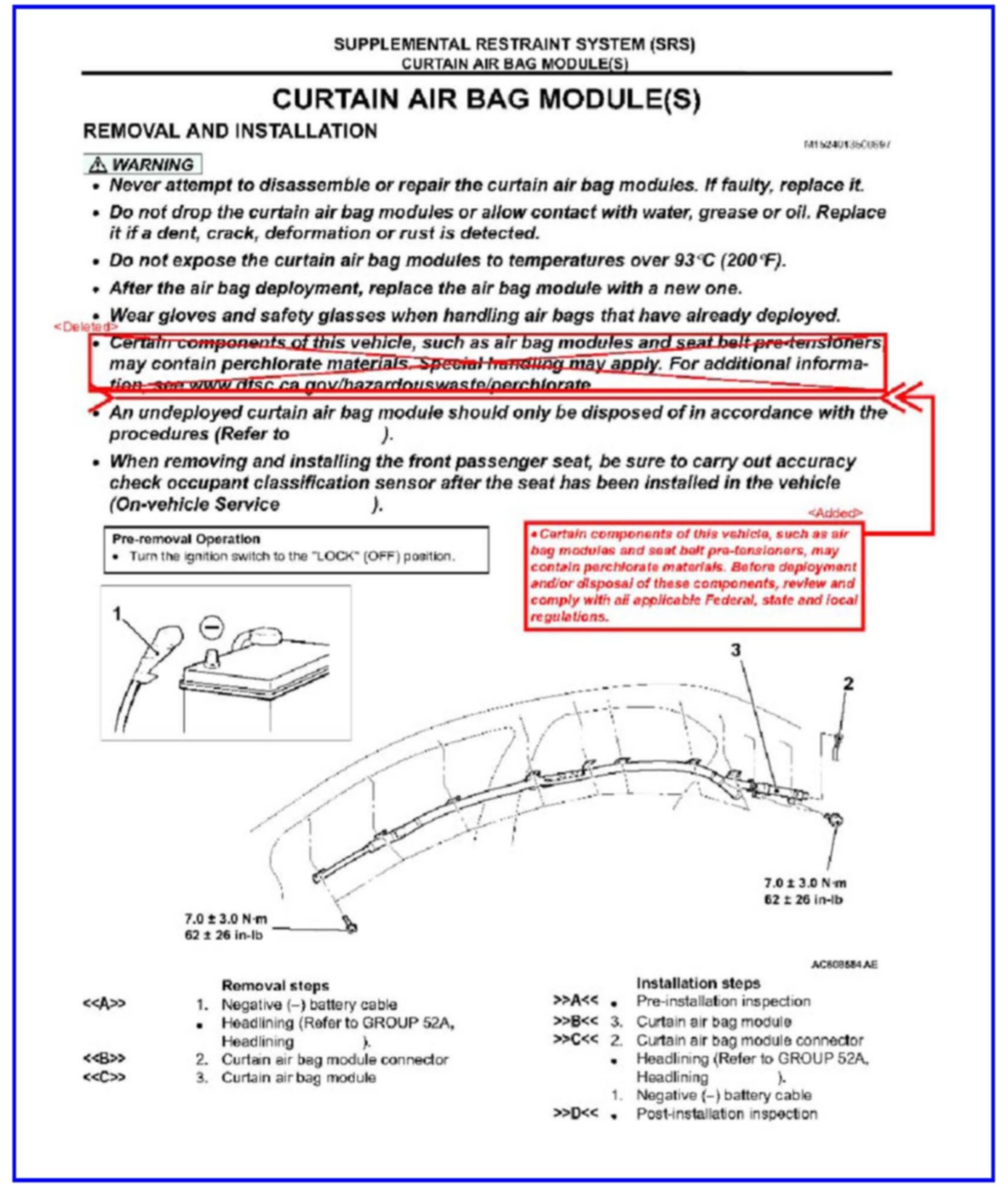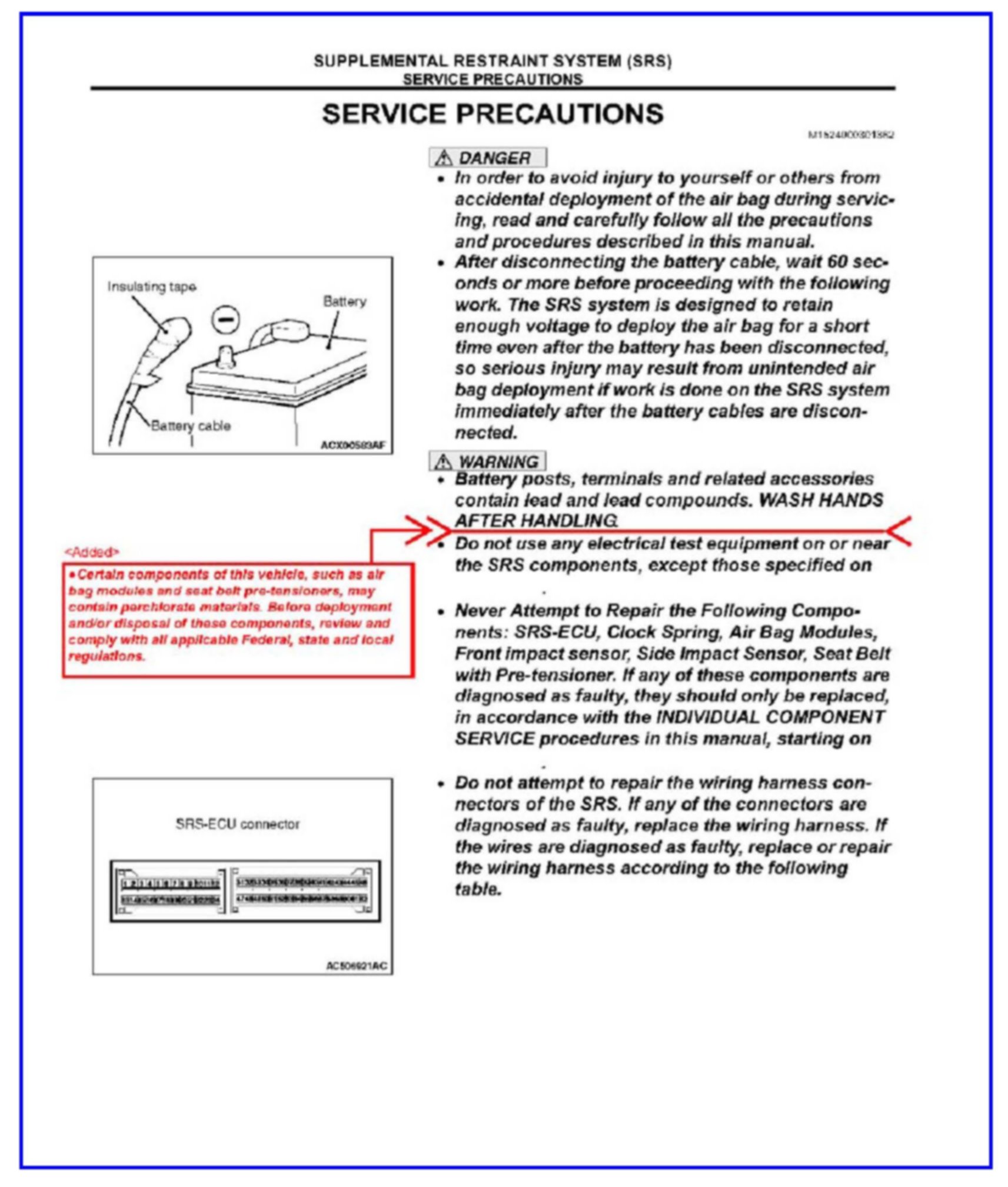 Caution statements regarding the disposal of certain SRS components have been incorrect in the service manuals of affected vehicles. This TSB provides updated caution statements.