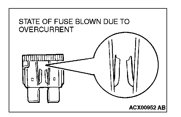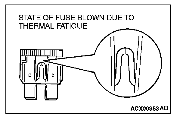 CAUTIONS IN EVENT OF BLOWN FUSEWhen a fuse is blown, there are two probable causes. One is that it is blown due to flow of current exceeding its rating. The other is that it is blown due to repeated on/off current flowing through it. Which of the two causes is responsible can be easily determined by visual check as described below.