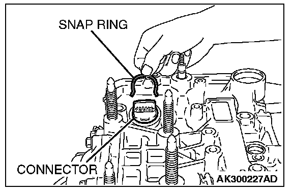 14. Remove the snap ring from the connector. Push the connector into the transaxle case and remove the solenoid valve harness.