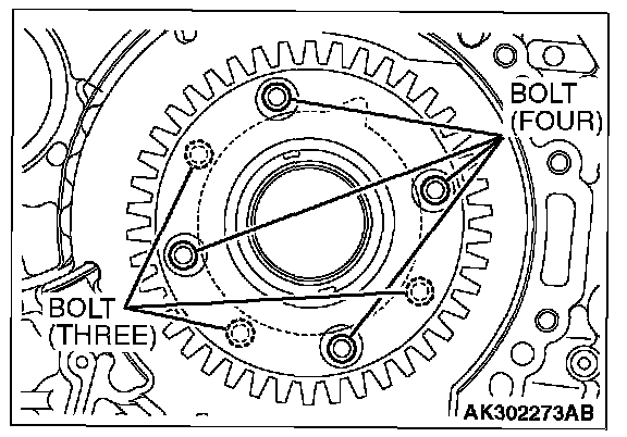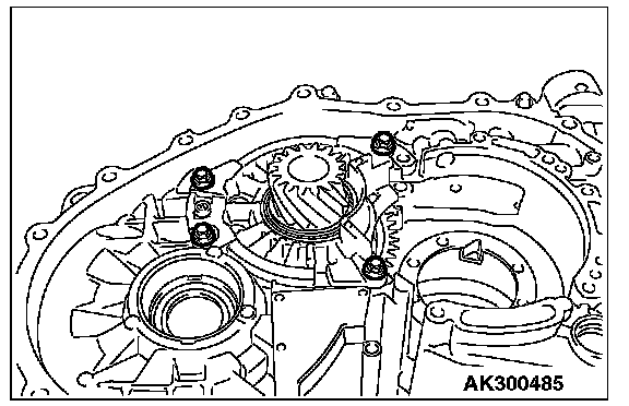 52. Remove the transfer drive gear bearing mounting bolts (three or four pieces). Then, turn the gear 1/8 turn (45 degrees) and remove the remaining bolts.