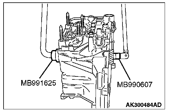 56. Use special tools MB991625 and MB990607 to remove the output shaft lock nut.