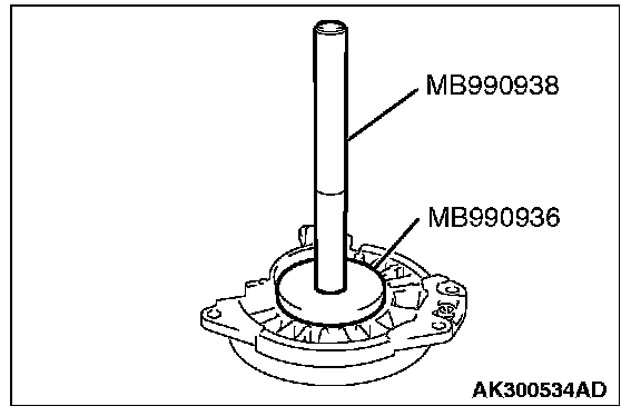 Use the special tools MB990936 and MB990938 to tap the outer race in the bearing retainer.