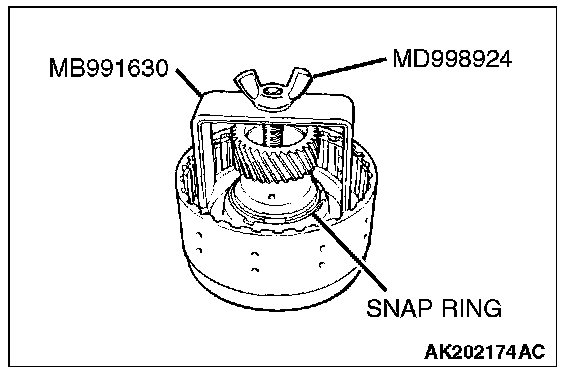 2. Using special tool to press down on the spring retainer, and then install the snap ring.