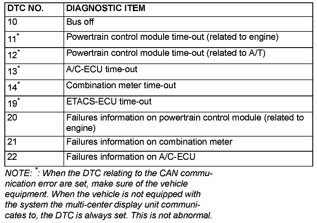 DIAGNOSTIC TROUBLE CODE CHARTNOTE: During diagnosis, a DTC code associated with other system may be set when the ignition switch is turned on with connector(s) disconnected. On completion, confirm all systems for DTC code(s). If DTC code(s) are set, erase them all.
