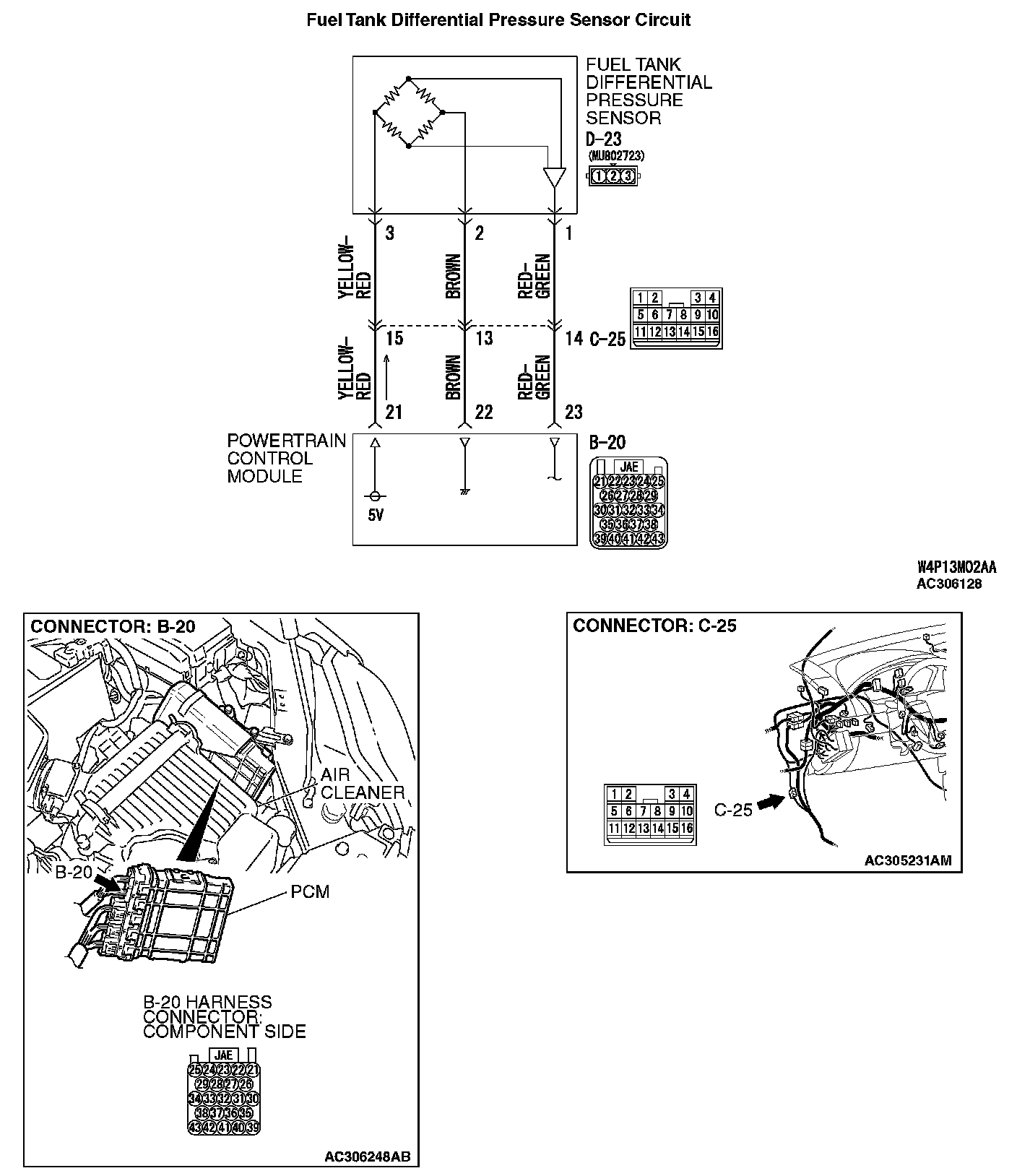 STEP 13. Check PCM connector B-20, intermediate connector C-25 and fuel tank differential pressure sensor connector D-23 for loose, corroded or damaged terminals, or terminals pushed back in the connector.