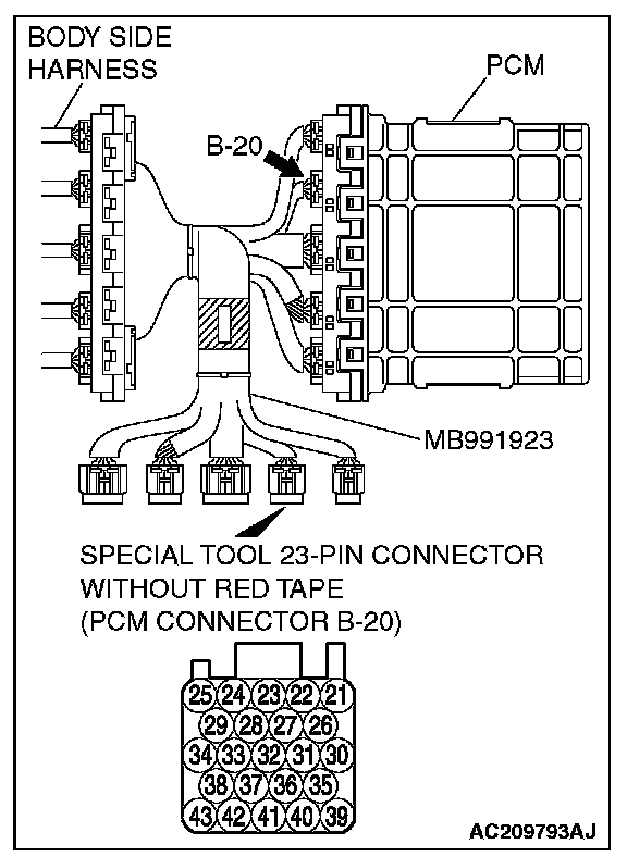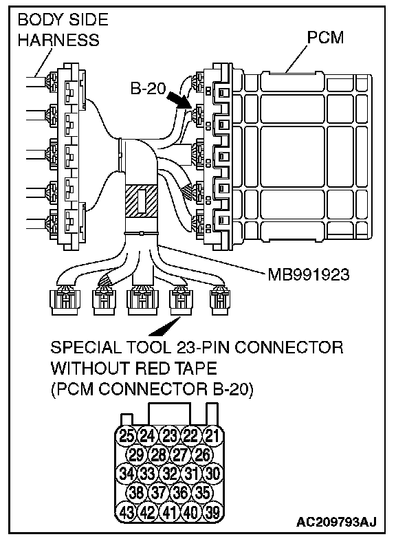 2. Connect special tool MB991923 (check harness) between the PCM and the body-side harness connector.
