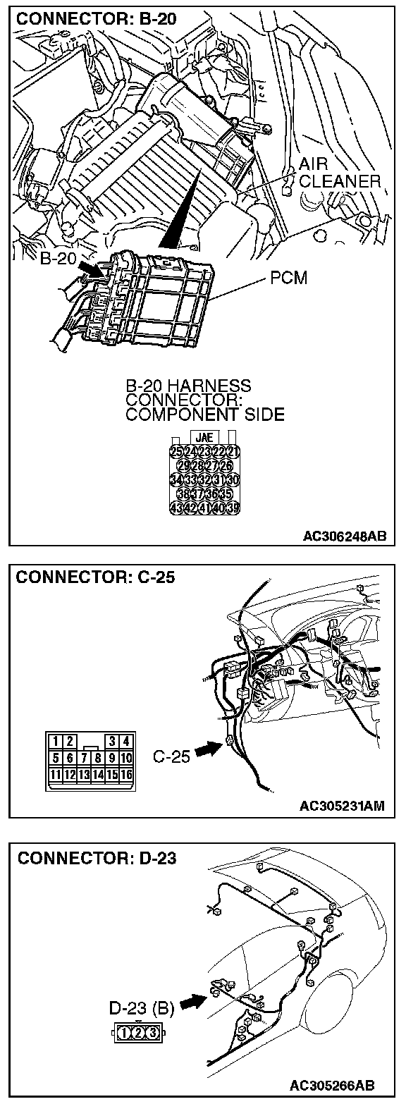 STEP 10. Check PCM connector B-20, intermediate connector C-25 and fuel tank differential pressure sensor connector D-23 for loose, corroded or damaged terminals, or terminals pushed back in the connector.