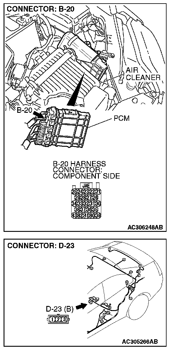 STEP 8. Check the harness wire between PCM connector B-20 terminal 23 and fuel tank differential pressure sensor connector D-23 terminal 1 for damage.