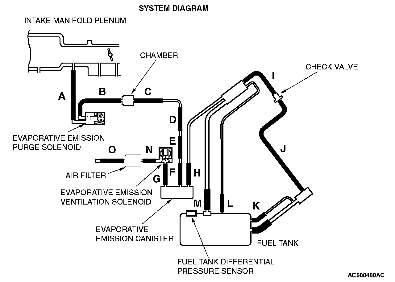 - To check for system blockage, do a performance test which uses a mechanical vacuum gauge and scan tool MB991958 set on the fuel tank differential pressure sensor (TANK PRS SNSR 73). The mechanical gauge reading is used to verify scan tool MB991958 reading. A comparison of the mechanical gauge with the reading on scan tool MB991958 will locate a problem in the system.