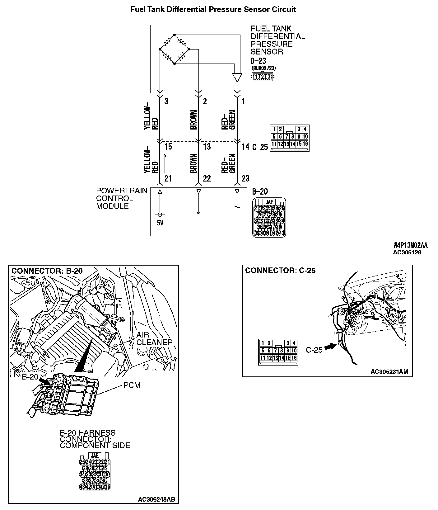 - The fuel tank differential pressure sensor (terminal 1) returns a voltage signal to the PCM (terminal 23) that is proportional to the pressure in the fuel tank.