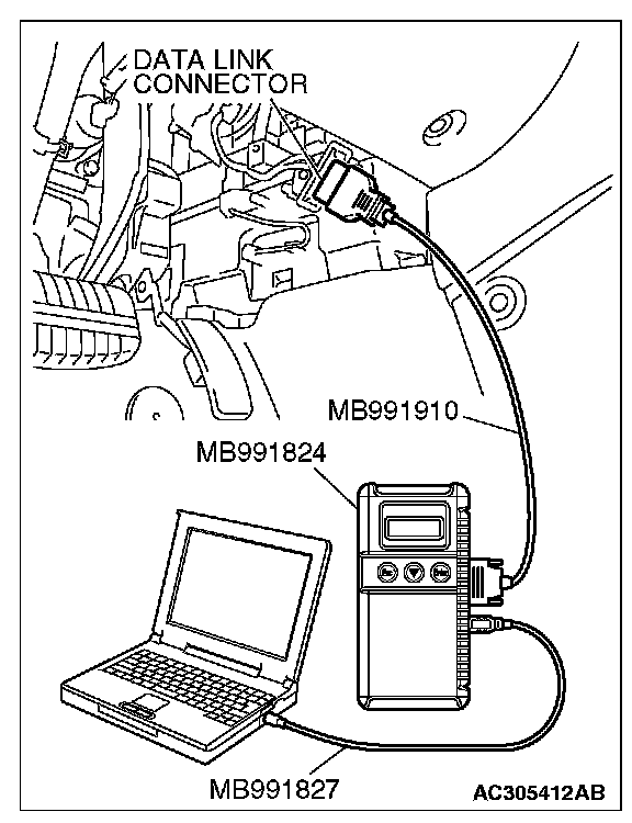 CAUTION: To prevent damage to scan tool MB991958, always turn the ignition switch to the "LOCK" (OFF) position before connecting or disconnecting scan tool MB991958.