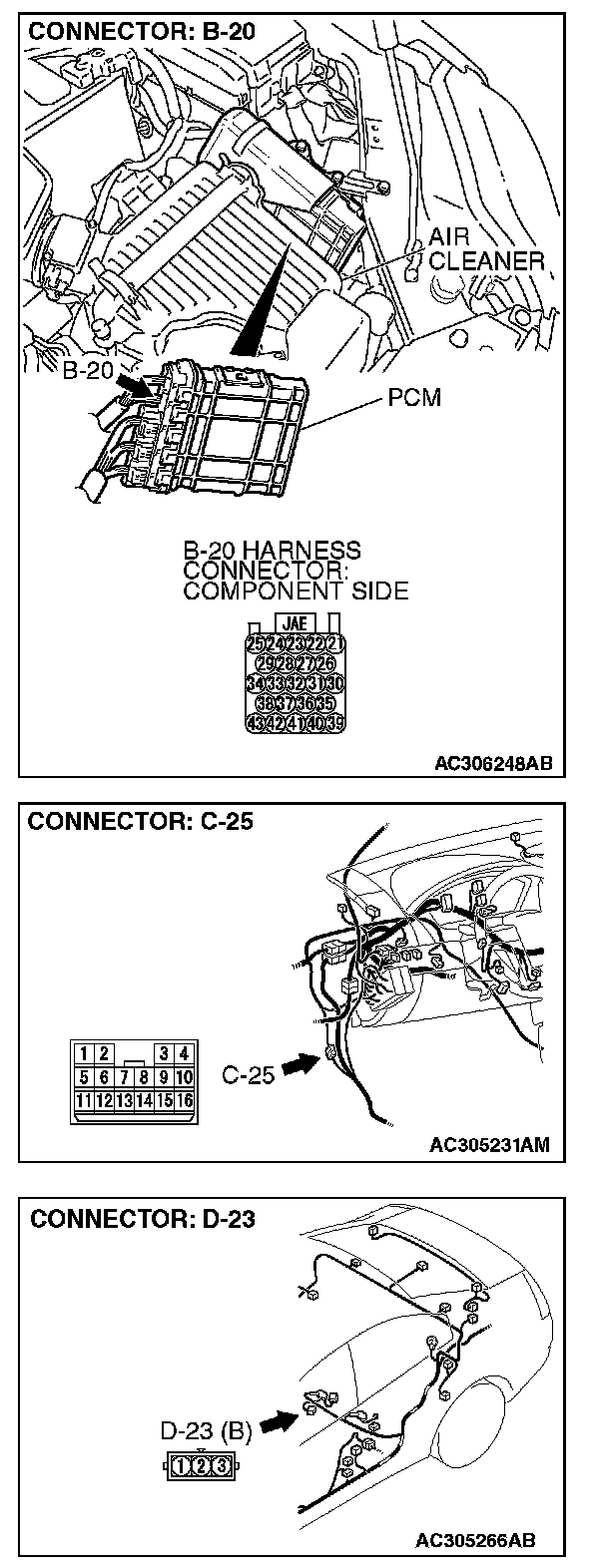 STEP 7. Check PCM connector B-20, intermediate connector C-25 and fuel tank differential pressure sensor connector D-23 for loose, corroded or damaged terminals, or terminals pushed back in the connector.