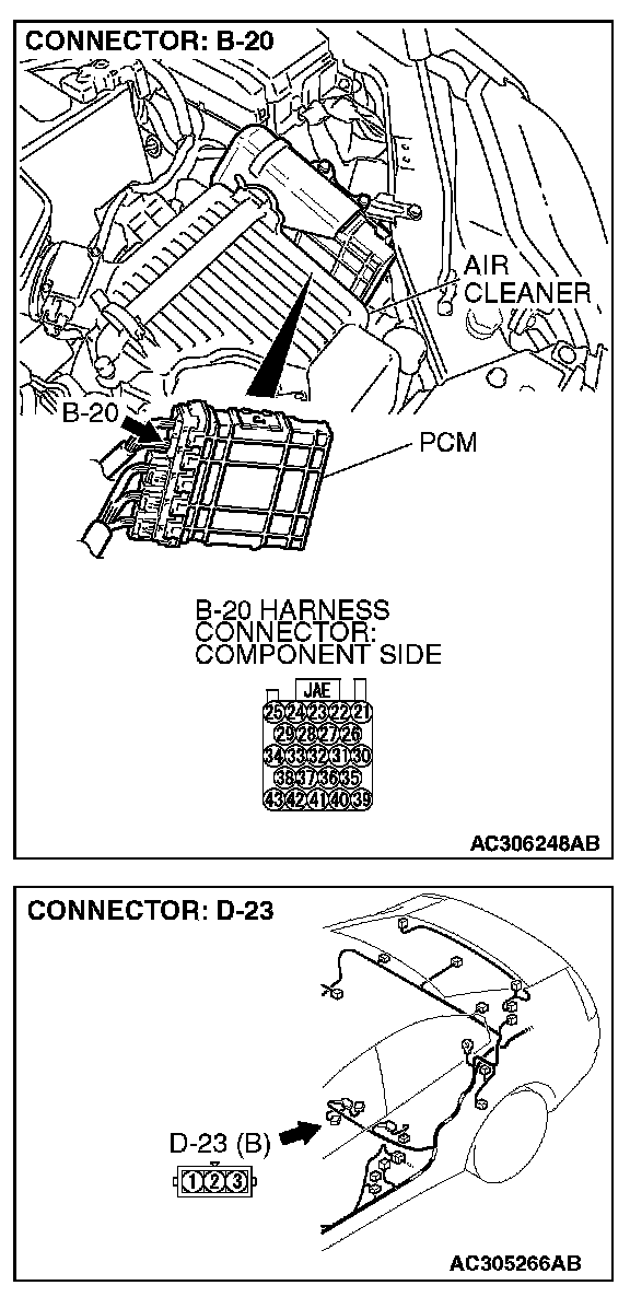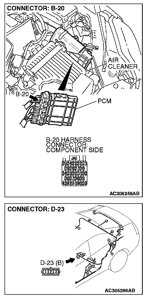 STEP 8. Check the harness wire between PCM connector B-20 terminal 23 and fuel tank differential pressure sensor connector D-23 terminal 1 for damage.