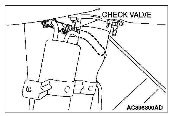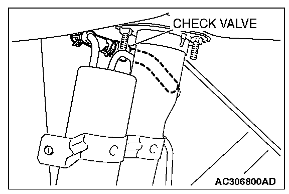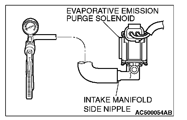 - When the evaporative emission purge solenoid valve is operated, apply a pressure on the hand vacuum pump and confirm that air is blown from the other side nipple.