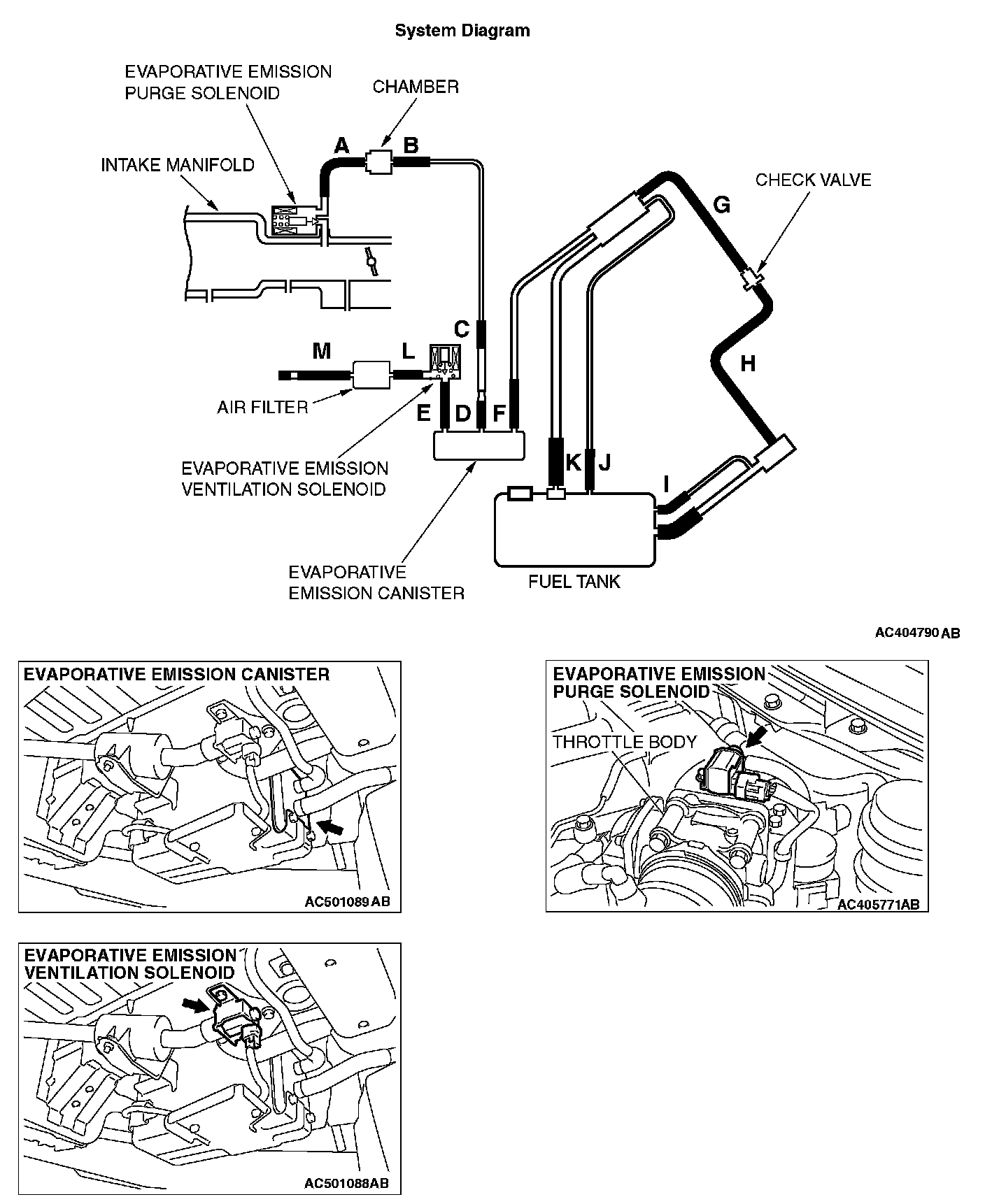 STEP 3. Check for leaks in evaporative emission hoses A through B.