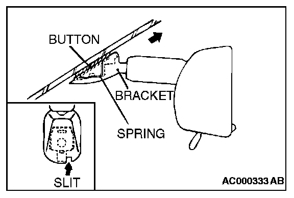 Insert a narrow flat-tip screwdriver into the slit in the inside rear view mirror bracket, keep the spring pushed in and remove the inside rear view mirror in the direction of the arrow in the illustration.