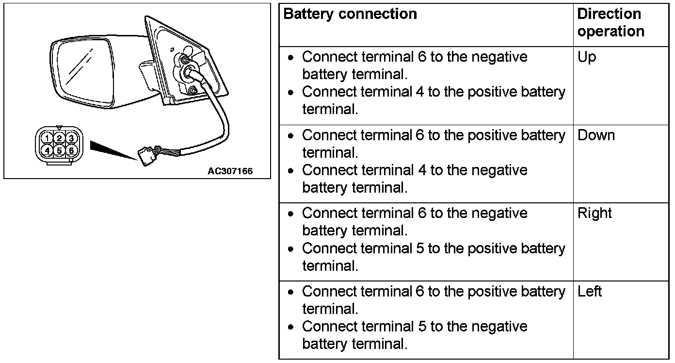 Check that the mirror moves as described in the table when each terminal is connected to the battery.