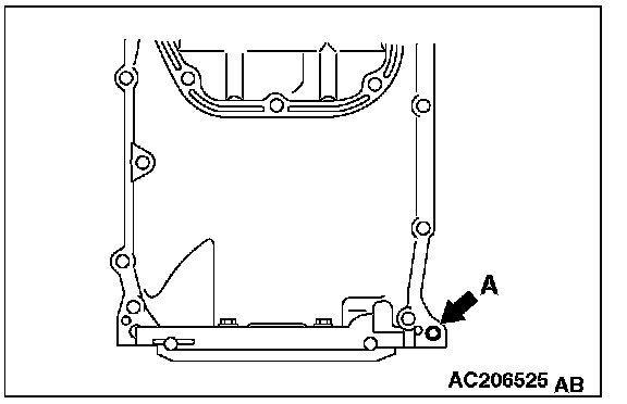 2. Screw in the bolt (M10) into bolt hole A in the location shown. Then lift the upper oil pan and remove it.