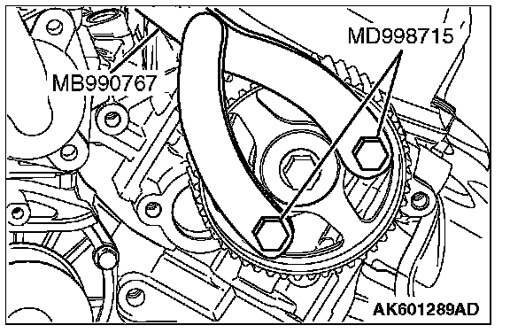 1. While holding the camshaft sprocket with special tools MB990767 and MD998715, loosen the camshaft sprocket bolt.