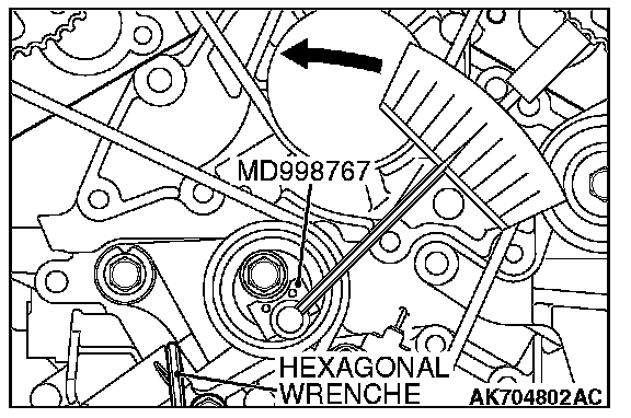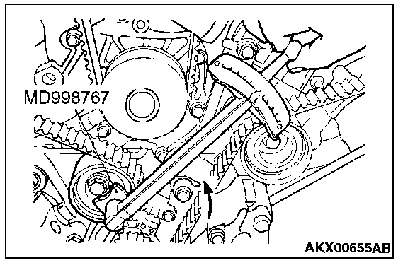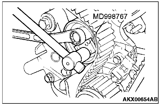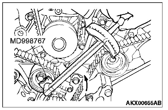 11. Loosen the flange bolt securing the tensioner pulley, and then mount special tool MD998767 and a torque wrench on the tensioner pulley.