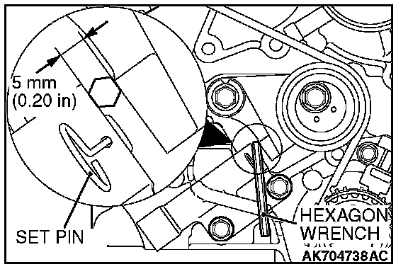 3. Insert a wire [1.4 mm (0.055 inch) in diameter] into the set holes. This auto-tensioner setting wire will be used during timing belt alignment.