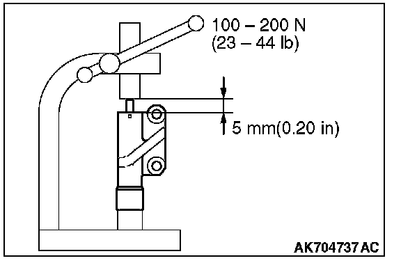3. When the rod protrusion has approximately 5 mm (0.20 inch), apply the load of 100 - 200N (23 - 44 lb). Check whether the auto tensioner has sufficient stiffness.