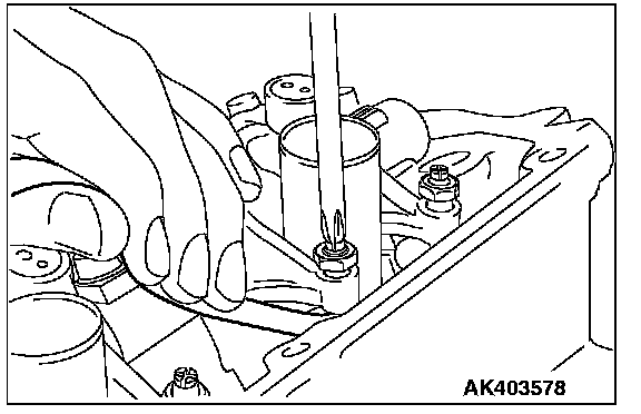 7. Lightly pressing the tensioner pulley against the belt, insert the hexagonal wrench having the width of 5 mm (0.2 inch) between the tensioner body and tensioner arm to temporarily tighten the center bolt.