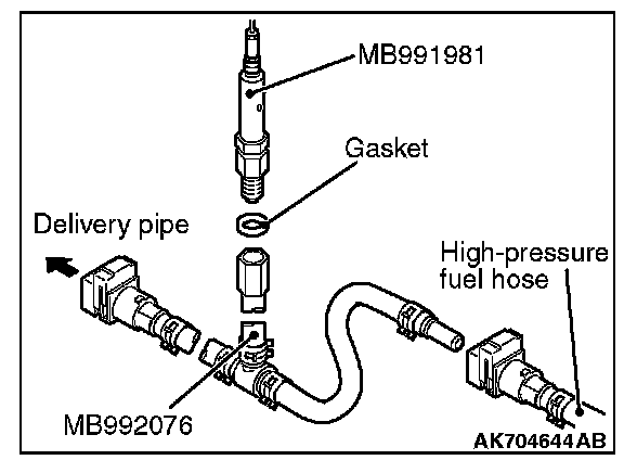 1. Via a gasket, install the special tool MB991981 (fuel pressure gauge set) into the special tool that has already assembled as described.