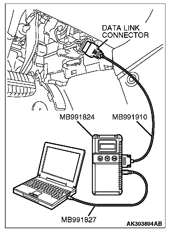 CAUTION: To prevent damage to scan tool MB991958, always turn the ignition switch to the "LOCK" (OFF) position before connecting or disconnecting scan tool MB991958.