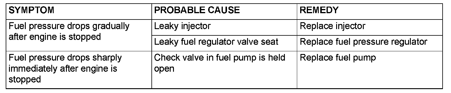 14. Stop the engine and observe fuel pressure gauge reading. It is normal if the reading does not drop within two minutes. If it does, observe the rate of drop and troubleshoot and repair according to the table below. Start, then stop the engine.