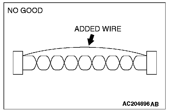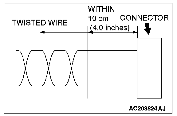 - If the connector or wire on the main bus line or the sub-bus wire is replaced, the strand end of the twisted wire should be within 10 cm (4 inches) from the connector. If it exceeds 10 cm (4 inches), twist the wiring harness just like the original twisted wire. If the strand end exceeds 10 cm (4 inches), noise suppression is deteriorated, causing a communication error.
