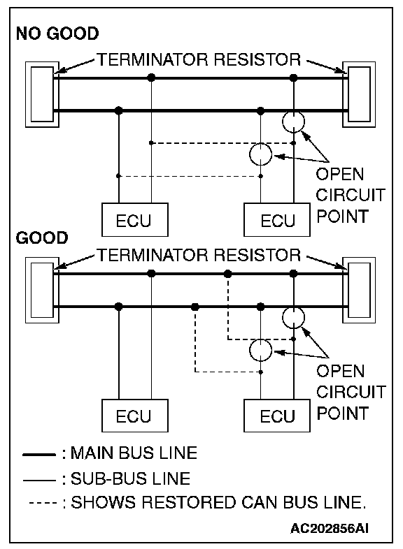 - If a sub-bus line is repaired, splice a new wire directly into the main bus line. If a new wire is spliced into the sub-bus line, which is connected to another device, the CAN communication will be disabled.