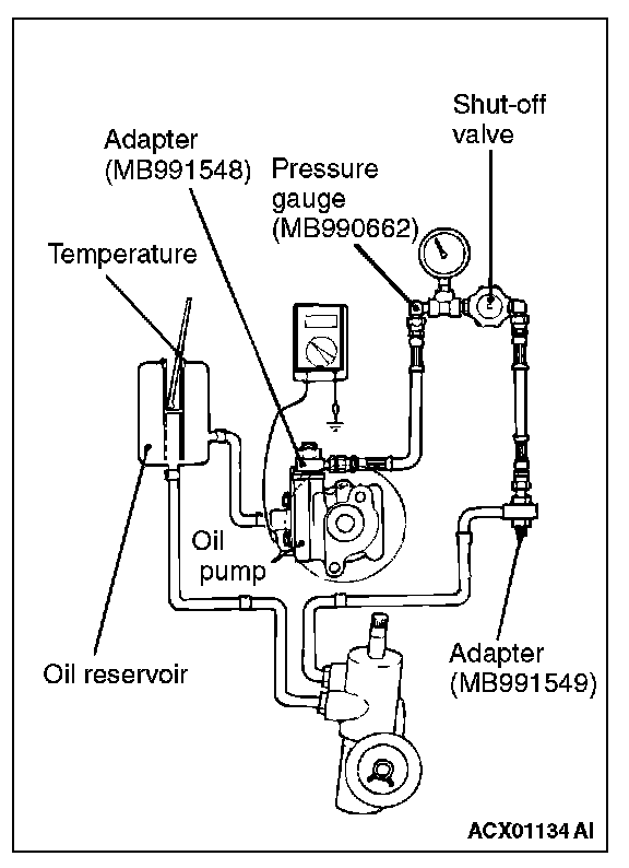 1. Disconnect the pressure hose from the oil pump, and then connect the special tools MB991548, MB990662 and MB991549.