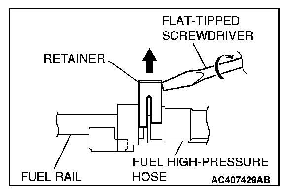 2. Turn the flat-tipped screwdriver approximately 90 degrees to the arrowed direction, and lift the retainer to unlock and disconnect the fuel high-pressure hose.
