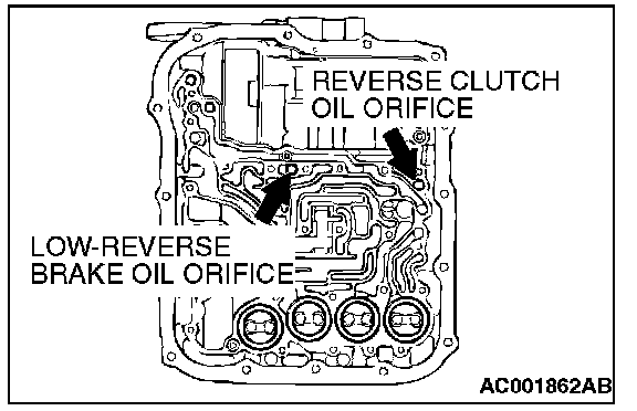2) Blow 108 kPa (15 psi) compressed air into the reverse clutch oil orifice of the transaxle case. Then check if the reverse clutch piston moves and air pressures are maintained in that condition. Repeat for the low-reverse brake.